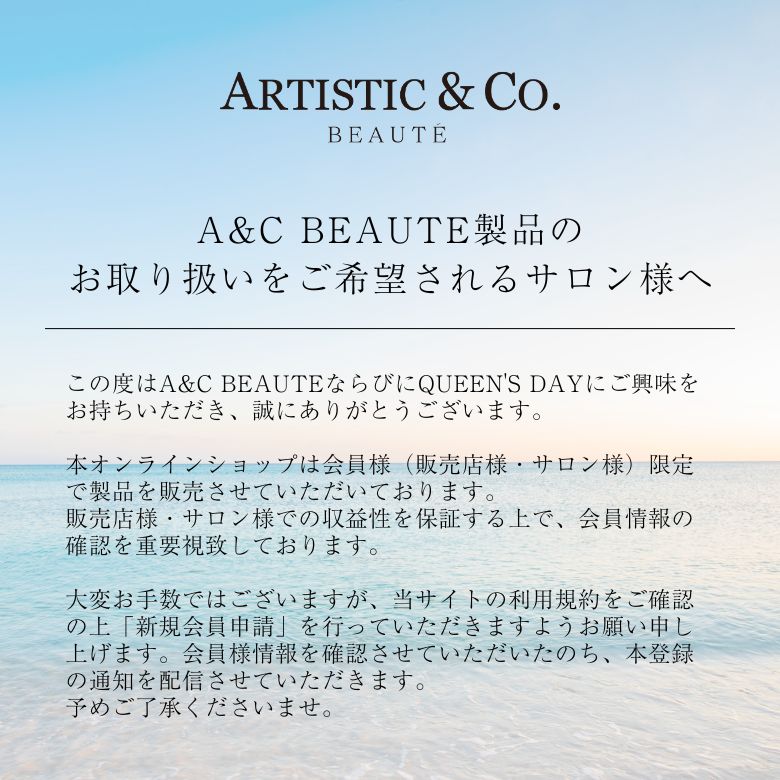 この度はA&C BEAUTEならびにQUEEN'S DAYにご興味をお持ちいただき、誠にありがとうございます。 本オンラインショップは会員様(販売店様・サロン様)限定で製品を販売させていただいております。販売店様・サロン様での収益性を保証する上で、会員情報の確認を重要視致しております。 ⼤変お⼿数ではございますが、当サイトの利⽤規約をご確認の上「新規会員申請」を⾏っていただきますようお願い申し上げます。会員様情報を確認させていただいたのち、本登録の通知を配信させていただきます。 予めご了承くださいませ。